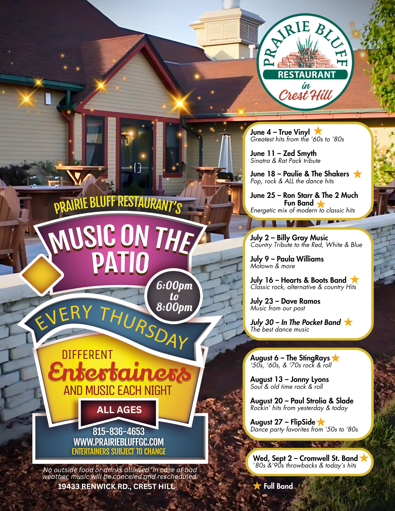 Date: August 6, 2026 Time: 6:00 pm – 8:00 pm Location: Prairie Bluff Golf Club Street: 19433 Renwick Rd. City: Crest Hill State: IL Zip: 60442 (815) 836-4653 Location information
